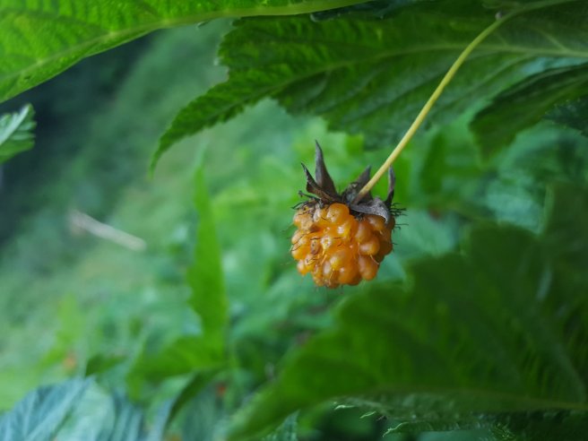 Salmon berry – telviragu diszsszeder. A narancssarga bogyonak meglepo modon leginkabb eretlen narancshoz hasonlito kesernyes ize van.