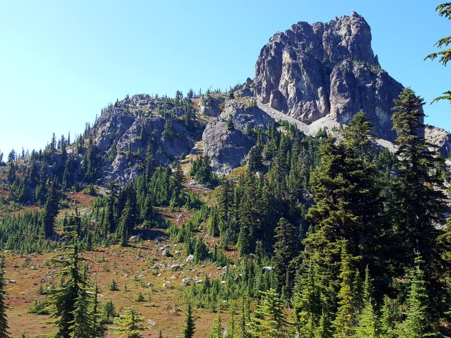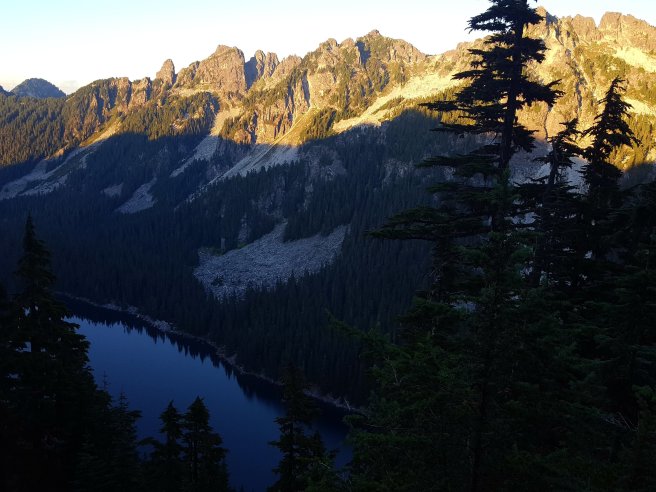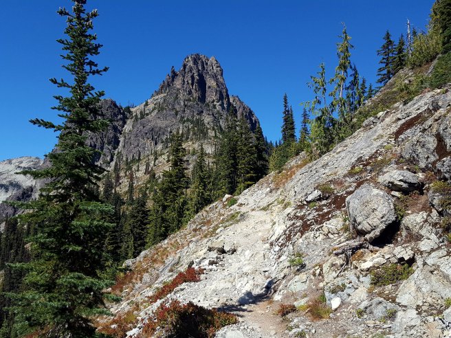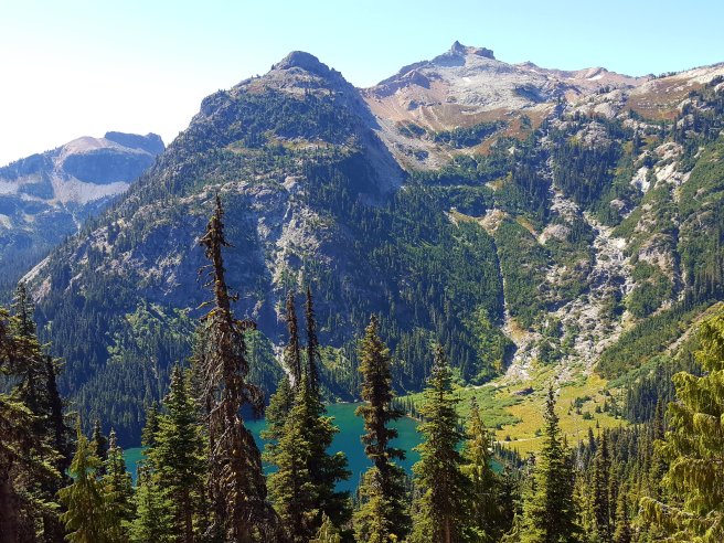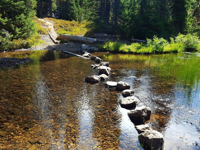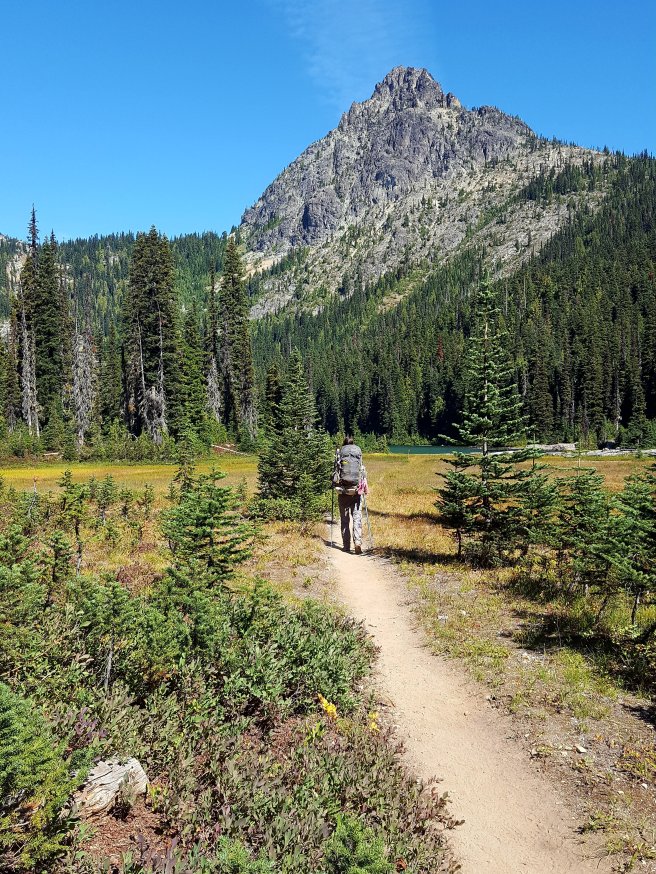 Itt pedig epp el vagyok tevedve, bar a kep keszitesenek pillanataban meg nem tudtam, hogy nem a PCT-n vagyok. Annyira feldobott a kanyargo osveny es mogotte a hegy latvanya, es az, hogy pont arra jart 2 turazo akiket meg lehetett kerni egy kep keszitesere, hogy nem vettem eszre egy elagazot. Mikor elertem a kepen lathato tavat, akkor ugrott be, hogy a reggeli terkepellenorzes soran ugy lattam, a to elott, az abbol kifolyo folyon kell atkelnem. Max 50m-t haladtam rossz iranyba, hogy aztan visszamenjek es a megfelelo helyen atkeljek a kis patakon.