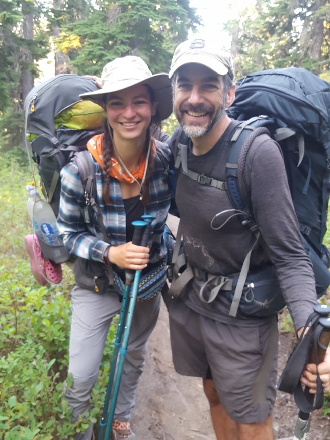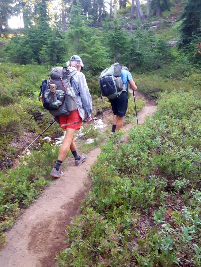 A nap masik nagy pillanata az volt, amikor megeloztuk a legidosebb PCT turazot. Mar hallottam rola korabban: 81 eves, es a fiaval turazik, aki 60 korul van. Ezen a kepen epp egy 70 eves elozi a 81 evest. Remelem most mar tenyleg senkitol nem hallom majd azt, hogy ‘tul oreg vagyok a turazashoz’. Amiben a kor tenyleg akadaly az a suly. Ok mar nem valaszthatnak, nekik ultrakonnyunek kell lenniuk, ha vegig akarjak csinalni. Erdemes megnezni a taskameretek kozti kulonbseget (az alabbi es a fenti kep, amin Tornadoval vagyok).