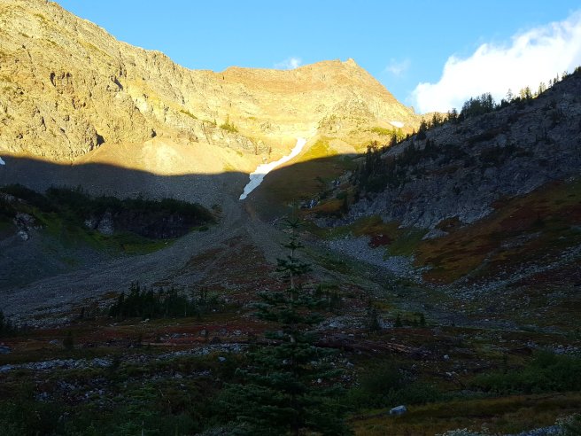 Mint kiderult azas szempontjabol ez volt a napom legrosszabb resze. Az eso elallt, nem volt tobb folyon atkeles, es talalkoztam szembe jovokkel is, akik elottem mar felitattak a viz nagy reszet a novenyekrol, igy lassan, de biztosan elkezdtem szaradni. 3 ora turazas kellett, de mindenem csontszaraz lett. A nadragom es a cipom is, a zoknimmal egyutt. Nem tudok betelni ezzel a testho dologgal. Nagyon kiraly. Kora delutan, mar boven a megszokott ebed idom utan ugy dontottem mar mozognak annyira az ujjaim, hogy tudjak enni. Elovettem mindent, ami menet kozben eheto (barmi, amit nem kell fozni, pl a tonhal konzerv kanallal is ilyen). Epp vegeztem, mikor azt vettem eszre, hogy egy medve fut lefele a hegyoldalrol, pont felem. Igen, egy igazi medve, nem egy nagyobb mormota. A szivem elkezdett hevesen dobogni, masodperc toredeke alatt eszembe jutott, hol tartom a kesemet. A taskam bal oldali pantjan log egy karabineren, hogy jobb kezzel a leheto leggyorsabban elerjem, ha szuksegem lenne ra. Kb ugyan ennyi ido alatt felmertem azt is, hogy erre most (meg?) nincs szuksegem. Helyette beugrott a szukseges scenario: biztonsagos tavolsagban levo medve (kb 15m), ami nem vesz eszre teged: Elso pont: Hivd fel magadra a figyelmet. Rakiabaltam, majd mozdulatlanul vartam a hatasat. A kettes pontra (tunj nagynak es meg hangosabbnak, emeld fel a botjaidat, mutasd neki a taskad) mar nem volt szuksegem. A botjaim amugy is, mint emlitettem, a tura soran eloszor, a taskamra voltak erositve. A maci leult, elforditotta a fejet, majd ugy dontott visszamaszik a hegyoldalra. Mondanam, hogy veszelyes helyzet volt, de nem volt az. Szerintem epp jatek kozben zavartam meg, olyan mokasan futott lefele. Sajnos kepem nincs, nem tartozik a tuleles elso pontjai koze egy jo selfie, de higyjetek nekem. A maci ott volt: