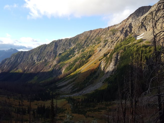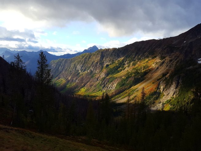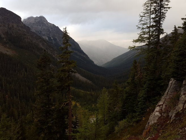 El is ertem a hegygerincet, ahonnan jol lathato volt: a kovetkezo volgy vegen, ahova tartok, Stehekin kornyeken, epp esik.