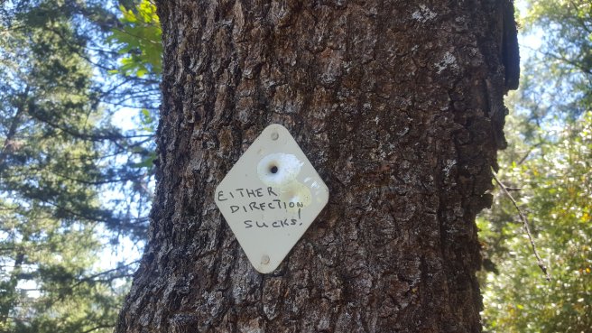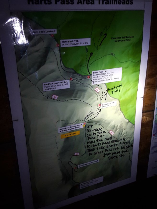 Volt egy sejtésem azzal kapcsolatban, hogy merre kell továbbmenni, de ezek az osvenyt keresztezo utak mindig bekavarnak, sotetben nehez megtalalni melyik van a helyes irany. Egy foldut, illetve egy (jelenleg ures) ranger allomas es egy kijelolt satrazo hely. Arra pont eleg volt, hogy leterjek a PCT-rol es a fejlampa szuk fenyenel kapasbol ne talaljam meg a folytatast. Megneztem a tablan a terkepet: nincs a fejemben a pontos utvonala a kerulonek, de abban biztos voltam, hogy az altalam ismertekhez kepest ez egy uj verzio.