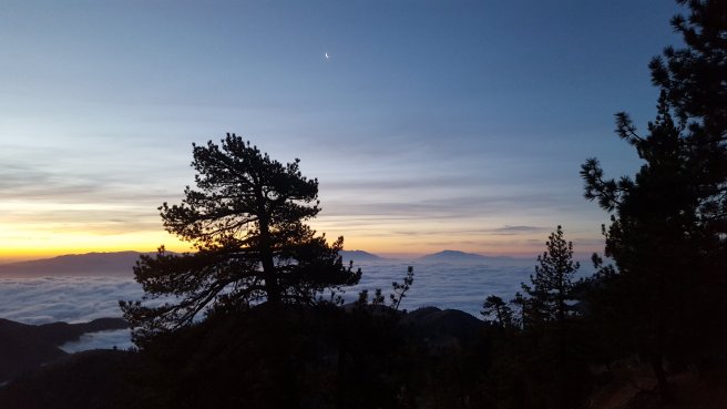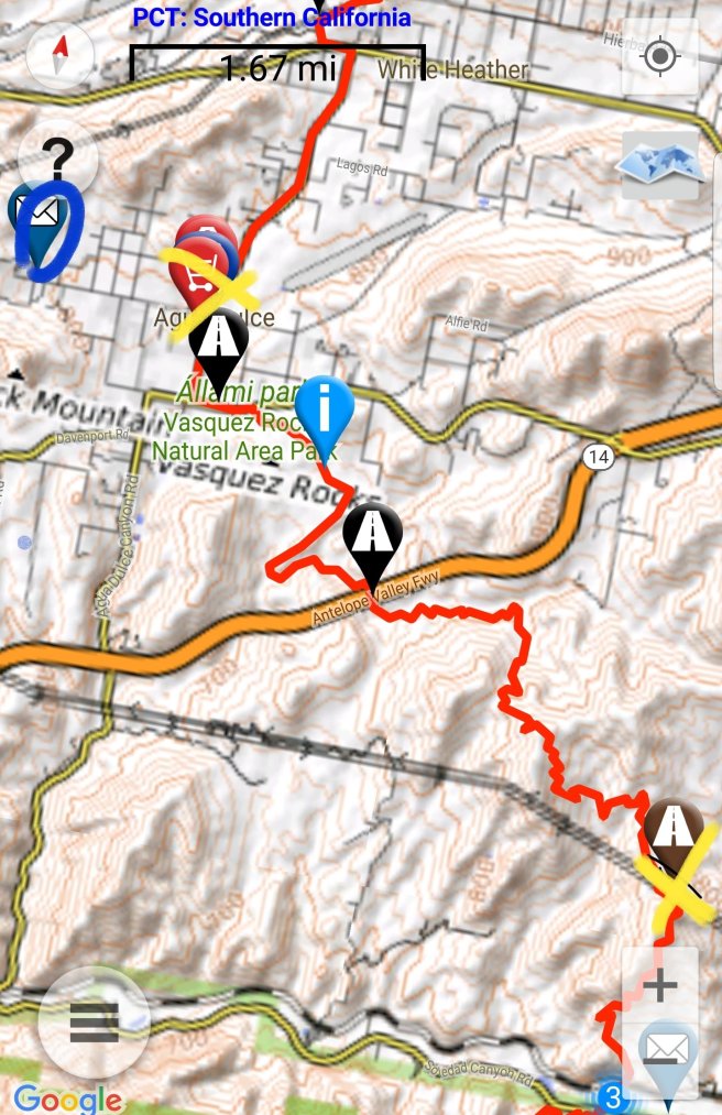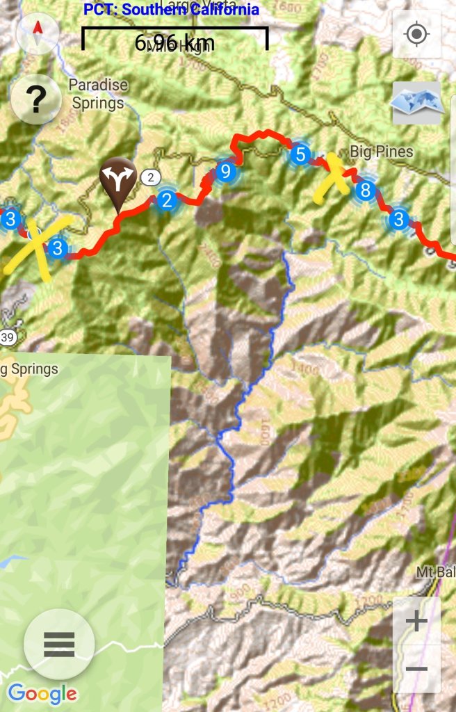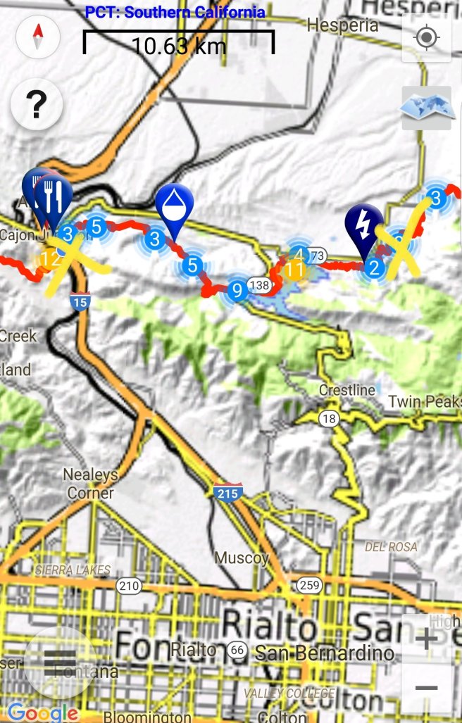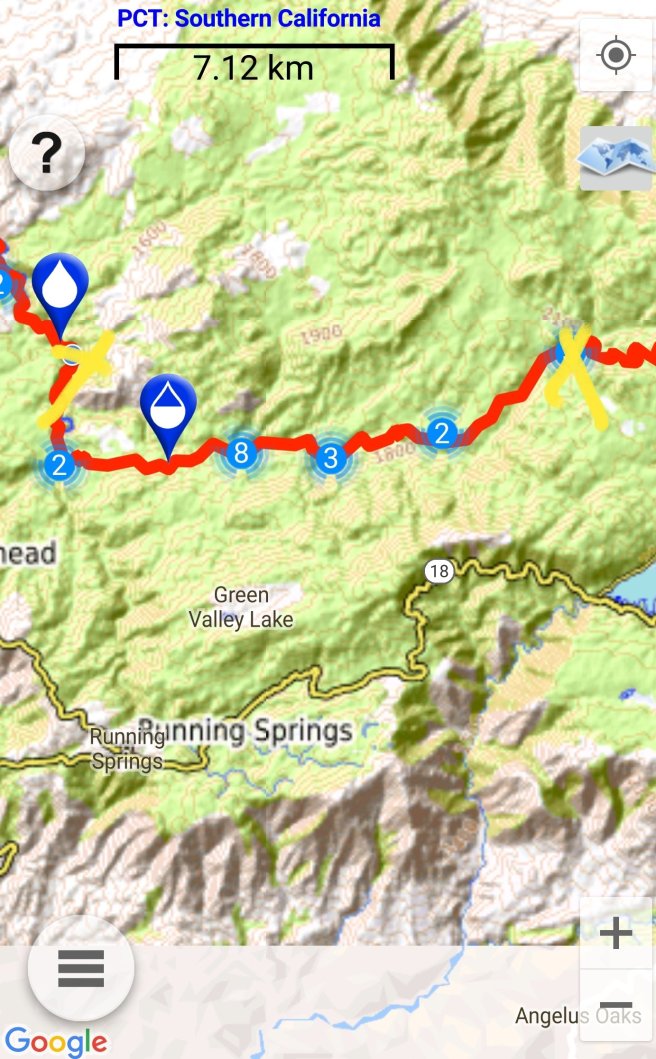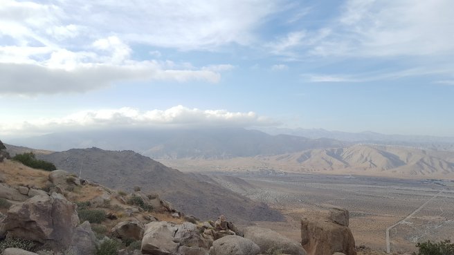 5 ora alvas utan kicsit szenvede keltem fel, hogy a koran induloktol megerdeklodjem mi a kovetkezo szakaszra a tervuk. Mivel a tegnapi napom a varosba erkezes utan eleg rohanos volt, nem tudtam eleget beszelgetni ahhoz, hogy magabiztosan induljak el kaja- es vizugyileg. Megtudtam, hogy 3 utvonal is vezet vissza a PCTre, ill. sokan terveztek felmenni a San Jacinto csucsara is ami egy kis kitero, de Del-Kalifornia egyik legmagasabb hegye es gyonyoru a kilatas. Illetve, kb 2 nap mulva vihar jon ami fent az osvenyen 2700on havazast jelent (igen, meg mindig a sivatagban vagyok), akkorra mar nem artana valahol lent lenni par szaz meteren. Nem volt mas valasztasom tehat, mint hogy utra keljek, mar csak a kozelgo vihar miatt sem. Kivalasztottam a legrovidebb felfele vezeto utat, a Deer Springs trailt (lenti terkepen kekkel jeloltem, nagyjabol merre haladt az osveny). Ez is 7km volt, ill. nem a ‘kenyelmes’ kis PCT stilusu osveny volt: meredek, sok kidolt faval es egyeb termeszetes akadallyal amin mind at kellett maszni. Ez az 5 napi kajaval es 5 liter vizzel nem volt tul kellemes. Valahogy mashogy telnek a kilometerek a PCTn es mashogy minden egyeb kitero turautvonalon. 1600m magasrol felmasztam 2700m-re, ahol vegre becsatlakoztam a PCT osvenyere. Mire elertem az elagazot a San Jacinto csucsa fele, mar 3 ora volt (delben tudtam csak elindulni). Mar reggel lattam, hogy elkezdtek jonni a felhok nyugat felol, de nem tunt ugy, hogy ebbol vihar lesz. Plusz ugy szamoltam, hogy belefer a csucsmaszas es sator allitas lejjebb az osvenyen naplemente elott. Raadasul megint osszefutottam Iannal, aki ugyan azt tervezte mint en, taskat lerakni az elagazonal es felmenni, majd az osveny menten satrazni. Szuper, nem vagyok egyedul, mehetuk!