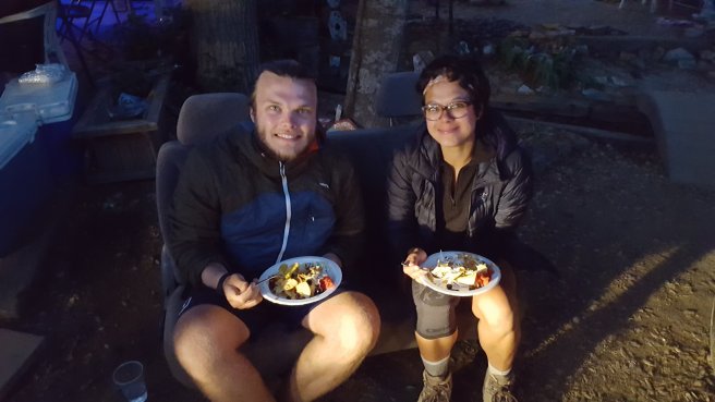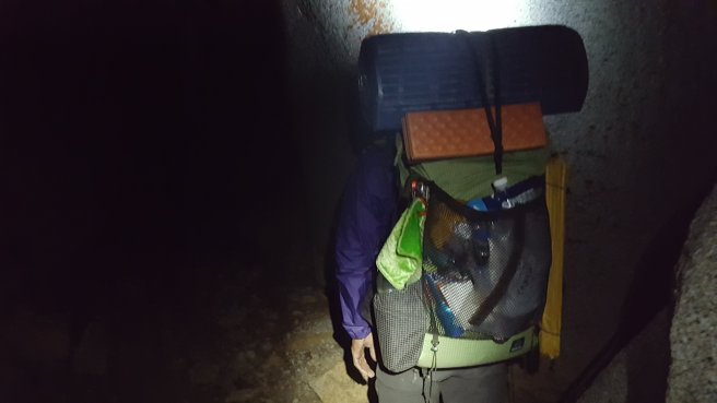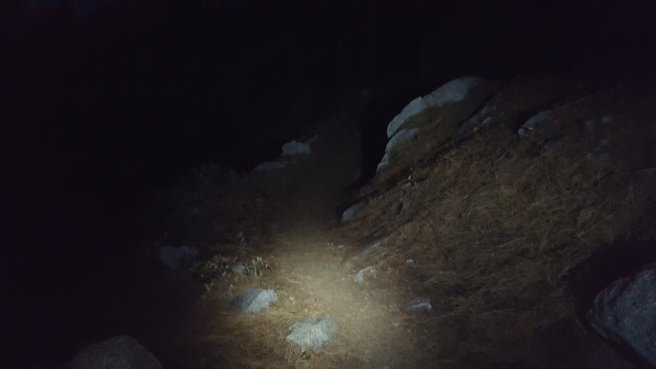 Leertunk az osvenyre sotetedes elott, de az mar nyilvanvalo volt, hogy a tervezett satorhelyre ahova mindenki ment nem fogunk elerni, csak ha kb 11ig turazunk, de a legelso taborhelyre is csak ejszakai turaval fogunk eljutni. Nem lehet am barhol satrat allitani ilyen meredek hegyoldalon, sokat kell setalni ahhoz hogy talalj egy sik terepet, ami megfelel. Kicsit izgultam, nem is a sotet miatt, hanem a naplementevel jaro hideg es szel miatt. Meg mindig 2700 m-en voltunk. Raadasul az utolso vizlelo hely a kovetkezo 30km-es szakasz elott is utkozben volt. 7 liter vizet atszurni nem ket perc, es nem is meleg viz folyik a hegyoldalon…