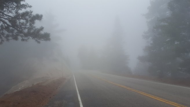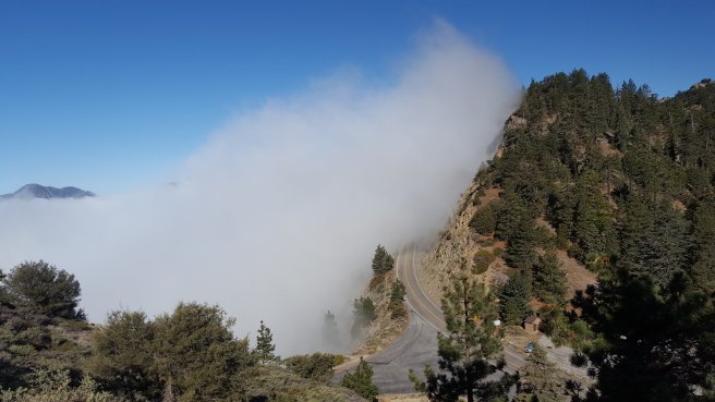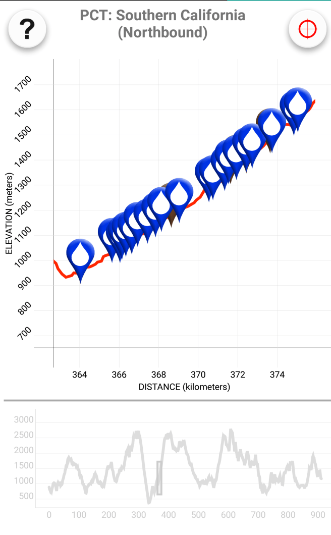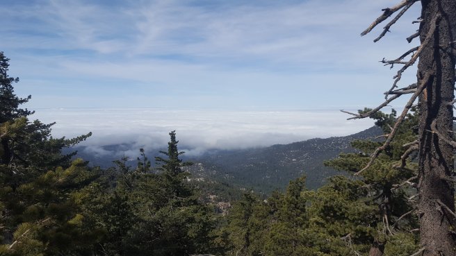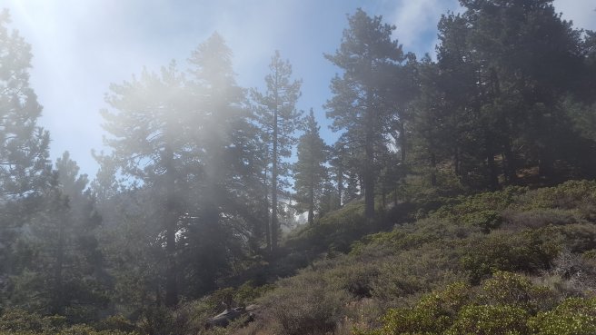 Szoval, a sargaval jelolt reszrol indultunk. Ez Del-Kalifornia PCT terkepe ahol latszik a szintemelkedes, korabban azert nem irogattam a szintemelkedesrol sokat mert amig fel-le megyek egesz nap, addig nincs ertelme osszesitgetni. Mivel most egyertelmu fel majd le iranyokban haladtam, igy most van. Mar megmasztam 1100m-t egy kb 20 kg-os taskaval, hatra volt meg 600m a csucsig. A felhok mar elertek a hegyet, indulasnal meg epp a fejunk felett, a fak tetejenel voltak, de boven felejuk masztunk.