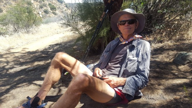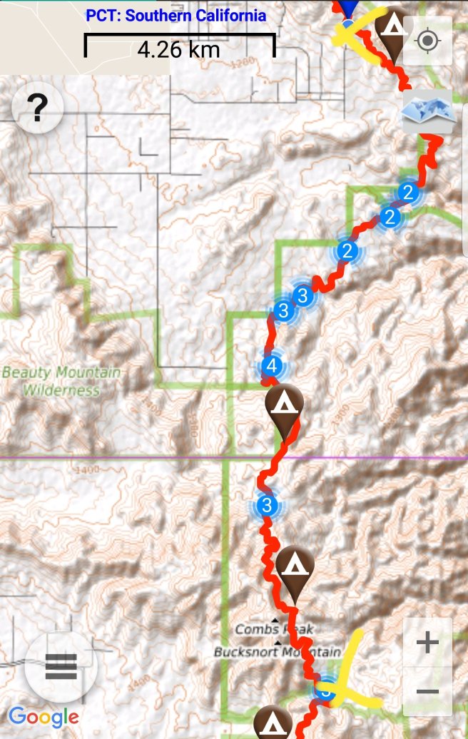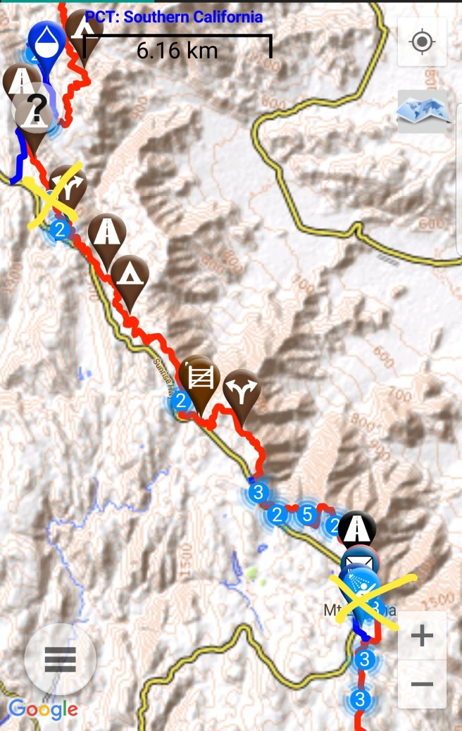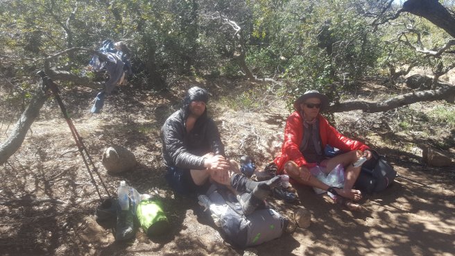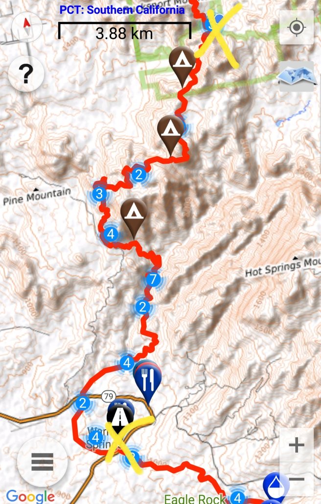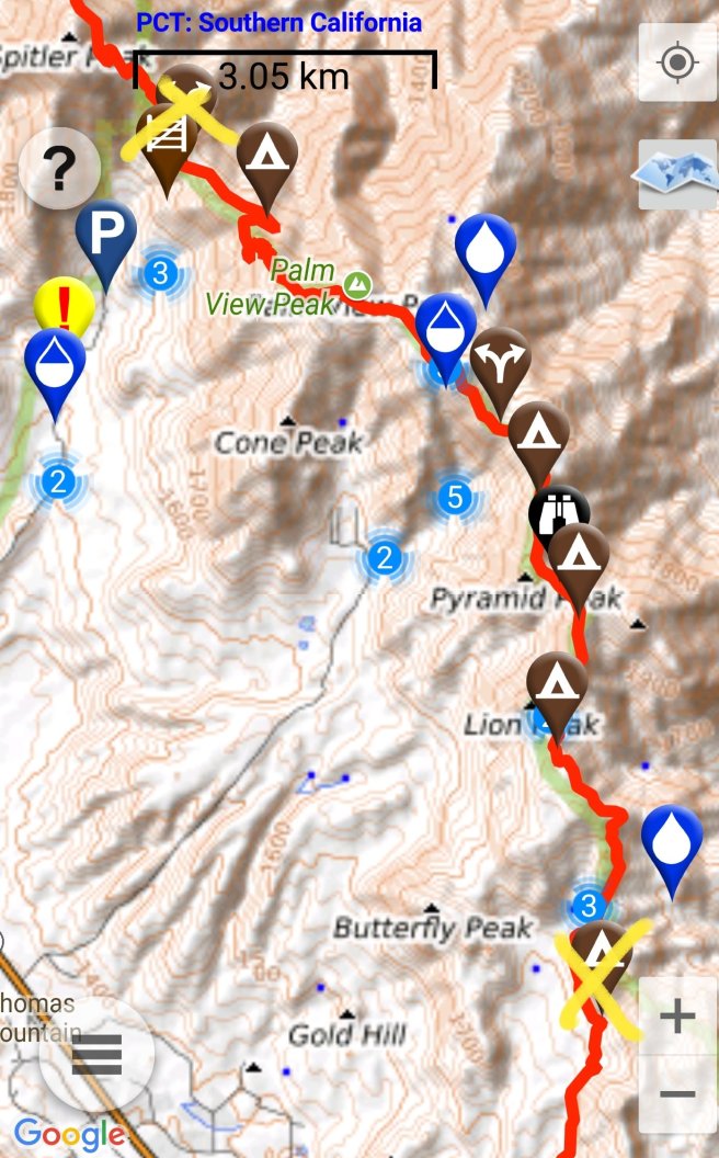 Az egyik kiteronk a kovetkezo vizlelo hely volt, amit a lenti terkepen teli feher csepp jelez. Nem latszik, de kb 200m-t lefele kellett menni hozza, majd ugyan ezt vissza. Nem volt mas valasztasunk, mivel tegnap nem ertunk el idaig (ez lett volna a cel), most muszaj volt. Nekem talan kitartott volna a vizem a tervezett stoppolasig Idyllwildba, de Nap-nek elfogyott mindene, igy mindharman lementunk. Visszafele talakoztunk egy masik csapattal: Thumb, Mouse, Surgeon, 3 lany aki mar regota sokszor latok utkozben ill. meg nehany ismeretlen. Surgeon azt tervezte, hogy azon az utvonalon jon le ahol mi, es onnan megy stoppal Idyllwildba. Kb 1 oraval elottuk jartunk (ennyit vett el a kitero a vizhez), de a szakasz vegen ugy dontottunk megvarjuk, hogy ne kelljen egyedul stoppolnia. Mar vagy masfel oraja vartunk amikor egy turazotol kaptuk a hirt, lebetegedett valaki kozuluk igy lassabban haladnak.